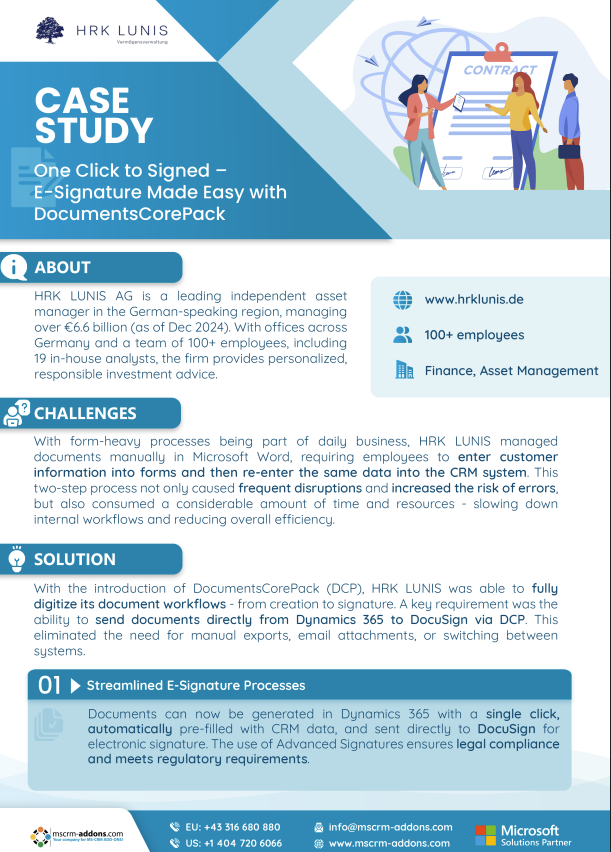 mscrm-addons develop intelligent tools that integrate well in Dynamics 365. The tools are fast, simple to use but have a huge array of features under the hood. Their tools are continually improved and supported at an elevated level. I would highly recommend their products. Based on our experience, we can testify that DocumentsCorePack is a sophisticated document generation offering. I would also like to thank everyone at mscrm-addons for their never-ending support and the development of bespoke solutions for our organization. Thank you!